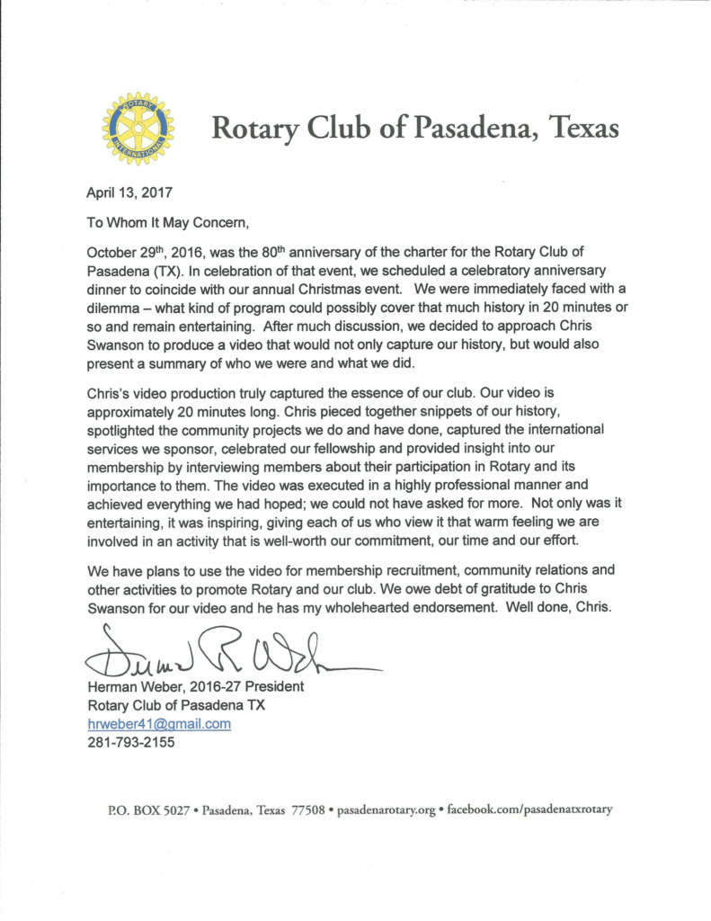 The production was shown at a dinner and the Rotarians were very pleased. Here is a letter we received from the club president. We were very happy to work with such fine citizens.